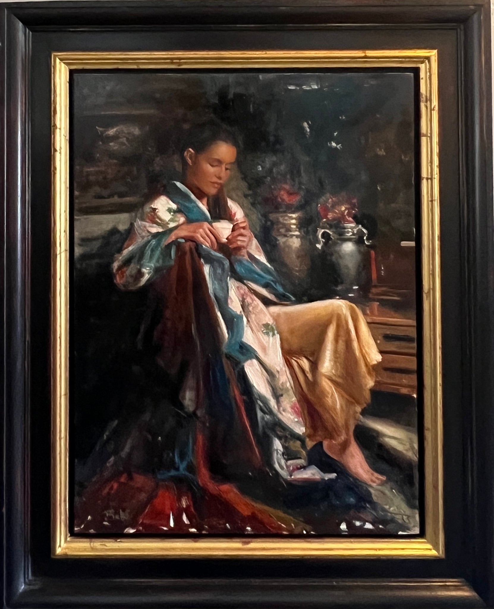 Sacred Introspection —a sacred space where contemplation unfolds, whether it be at the end of a very full day, or in the quiet of the early hours, revelation comes in moments of pause, when the noise of the world fades, and we seeks solace, clarity, and guidance from both within and beyond. The contrast between energetic strokes and serene moments of stillness mirrors the balancing act of inner turmoil and peaceful resolution. It is a portrayal of personal reflection, a journey toward understanding that speaks to the universal need for introspection, healing, and growth.